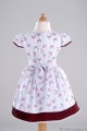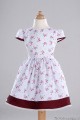 Sukienka koktajlowa z krótkim rękawkiem w kolorowej bawełny (100%), ozdobiona plisą w kolorze bordowym, z paskiem pozwalającym na dopasowanie w talii. Całość na podszewce z wiskozy, w dolnej części usztywnionej tiulem.