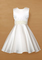 Sukienka dziewczęca uszyta z satyny ślubnej w kolorze kremowym, rozkloszowany dół sukienki. W całości na podszewce, której dolna część usztywniona jest falbanami z tiulu, co sprawia, że sukienka pięknie się układa. Zapinana na kryty zamek. Całość wykończona efektownymi różyczkami w pasie, pasek z tyłu wiązany w kokardę, co pozwala na dopasowanie w talii do figury.