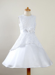 Sukienka uszyta jest z satyny ślubnej, karczek pokrywa koronka , na rozkloszowany dół sukienki nałożona jest baskinka pokryta koronką gipiurową . W całości na podszewce, której dolna część usztywniona jest falbanami z tiulu, co sprawia, że sukienka pięknie się układa. Zapinana na kryty zamek. Całość wykończona efektowną kokardą.