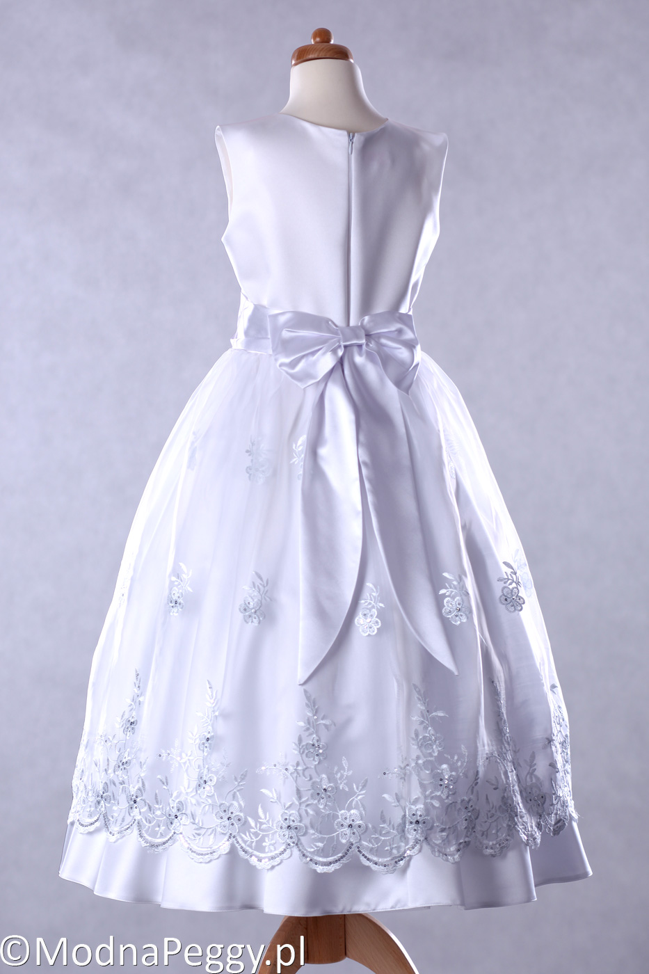 Niezwykle atrakcyjna dwuwarstwowa suknia wykonana z satyny ślubnej, dół pokryty bogato haftowaną organzą, ozdobioną koralikami oraz cekinami. Całości dopełnia satynowy pasek , z tyłu wiązany w kokardę, co pozwala na dopasowanie w talii do figury. Może być długa lub o długości ¾. Zapinana na kryty zamek.Całość na podszewce, w dole podszewki podwójny, usztywniający tiul.
